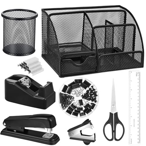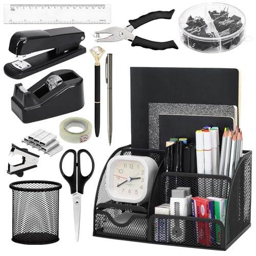 Black Desk Organizer and Accessories, Black Desk Asccessories Office Supply Kit Include Mesh Desktop Organizer Stapler 1000 Staples Tape Dispenser Pen Holder Staple Remover Clips Ruler Scissors